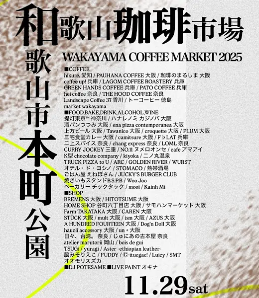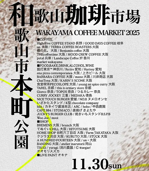 コーヒーを中心に、屋台・キッチンカーや雑貨・古着などが集まるイベント、『和歌山珈琲市場』が本町公園で11/29・30に開催されます。