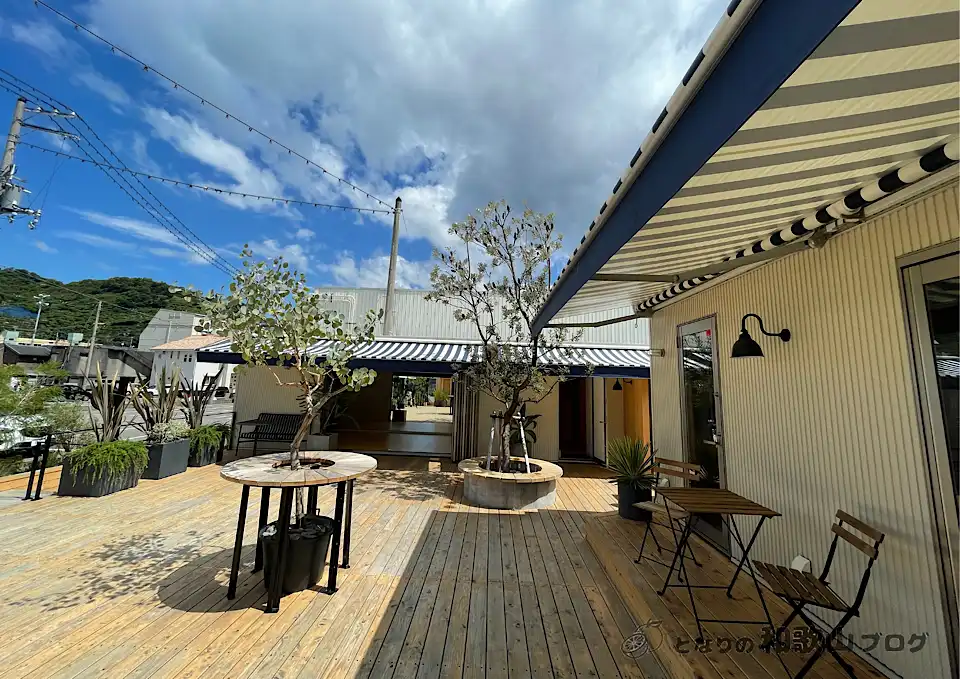 2022年5月に開店したこの店舗は、3台のトレーラーハウスをウッドデッキの中庭でつなげたお洒落な外観。