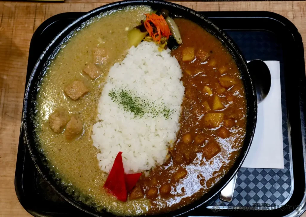 この日のあいがけカレーは「ひよこ豆とじゃがいものカレー&国産鶏胸肉のグリーンカレー」でした!