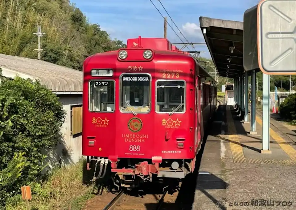 紀州和歌山の名産、梅干をあしらった「うめぼし電車」です。遠くから見るとおもちゃ電車と似ていますが、こちらの方が渋くて落ち着いた赤色をしています。