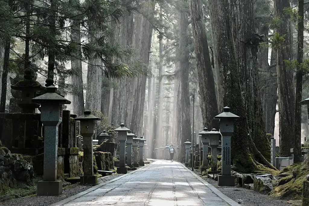 「奥之院(おくのいん)」は弘法大師空海の御廟へと続く参道。杉の巨木と苔むす石塔に囲まれた静謐な道は、朝夕に一層の荘厳さを帯びます。