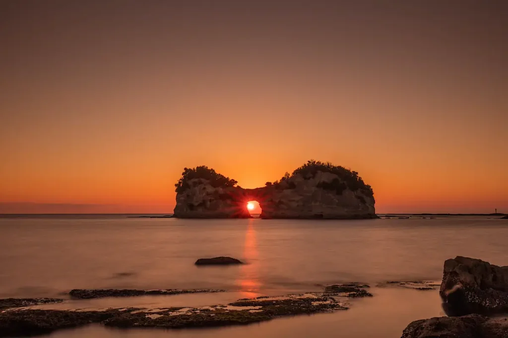 円月島は中央に円い海蝕洞が空いた小島で、夕日が島の穴に重なる瞬間が特に人気。晴天日・凪の日は鏡のような海面に光が伸び、絵画のような一枚が狙えます。